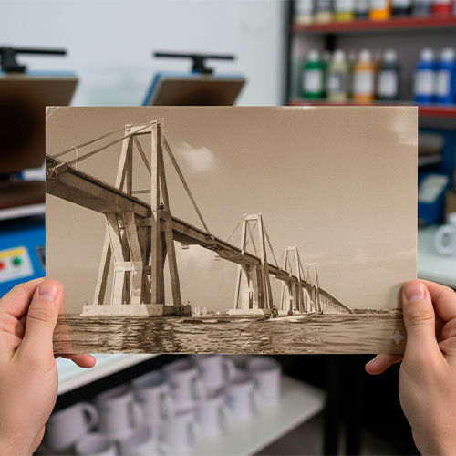 Lámina de aluminio personalizada con una majestuosa vista en tono sepia del Puente Rafael Urdaneta. Una pieza icónica y nostálgica que rinde homenaje al Puente sobre el Lago de Maracaibo, fabricada con acabado metálico de alta durabilidad para realzar cada detalle arquitectónico en tu colección.